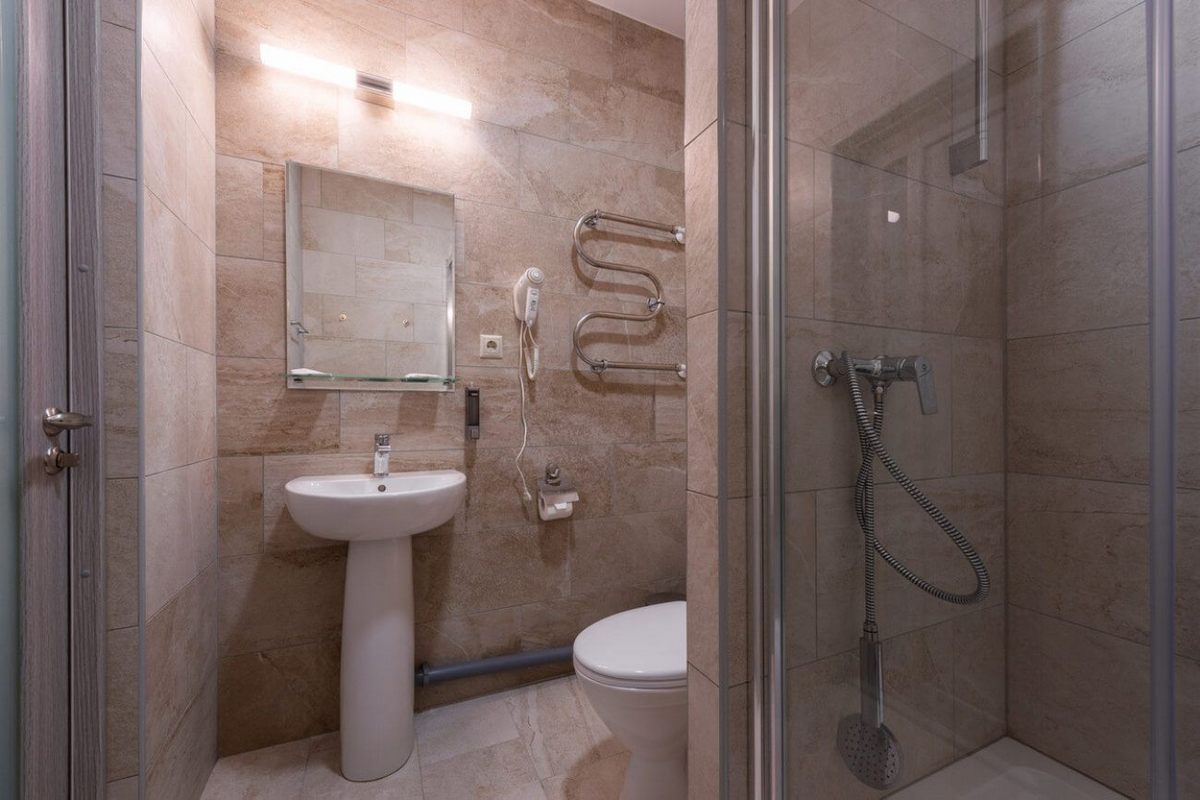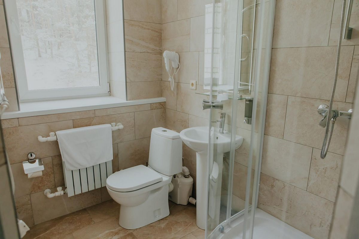 Санузел: душ, раковина, унитаз, фен