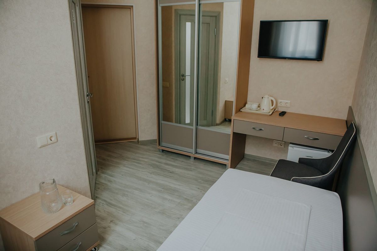 Оснащение номера: односпальная кровать, прикроватная тумбочки, стол, стулья, шкаф для одежды, набор посуды, телевизор, телефон, холодильник, электрический чайник
