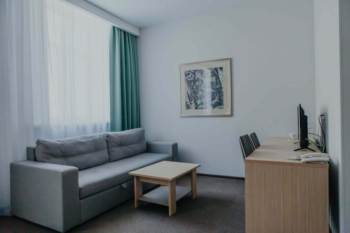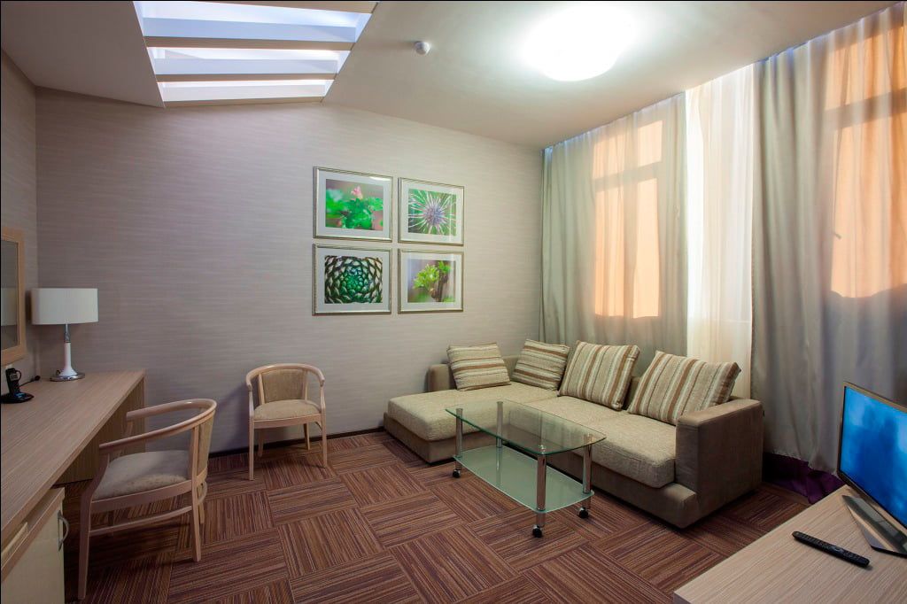 Оснащение номера: двуспальная кровать, прикроватные тумбы, стол, стулья, шкаф для одежды, диван, журнальный стол, набор посуды, телевизор, телефон, холодильник, электрический чайник, сейф
