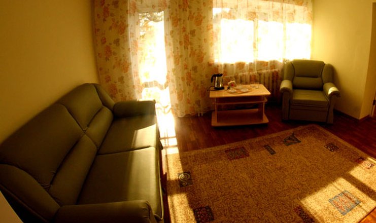 В номере: зеркало, кровать двуспальная, кровать односпальная, набор мягкой мебели, прикроватные тумбочки, стол, стулья, шкаф, набор посуды, телевизор, холодильник, чайный набор посуды, электрочайник