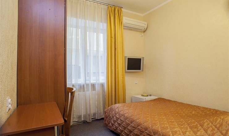В номере: две односпальные кровати, прикроватные тумбочки, стол, стул, шкаф, кондиционер, набор посуды, телевизор, телефон, холодильник