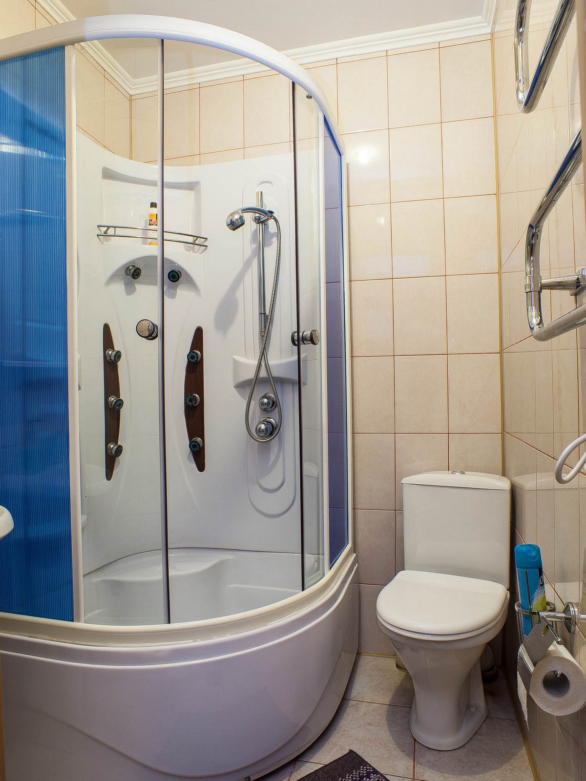 Санузел: душевая кабина, раковина, унитаз, фен, гигиенические принадлежности, тапочки
