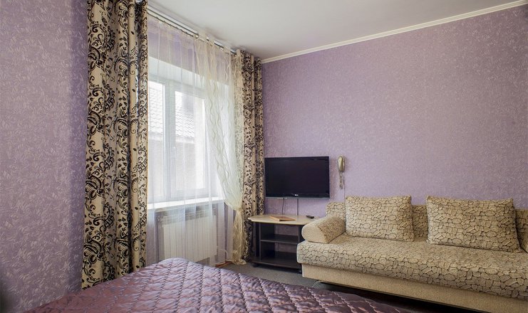 В номере: двуспальная кровать, прикроватные тумбочки, стол, стул, шкаф, диван, журнальный столик, кондиционер, набор посуды, телевизор, телефон, холодильник
