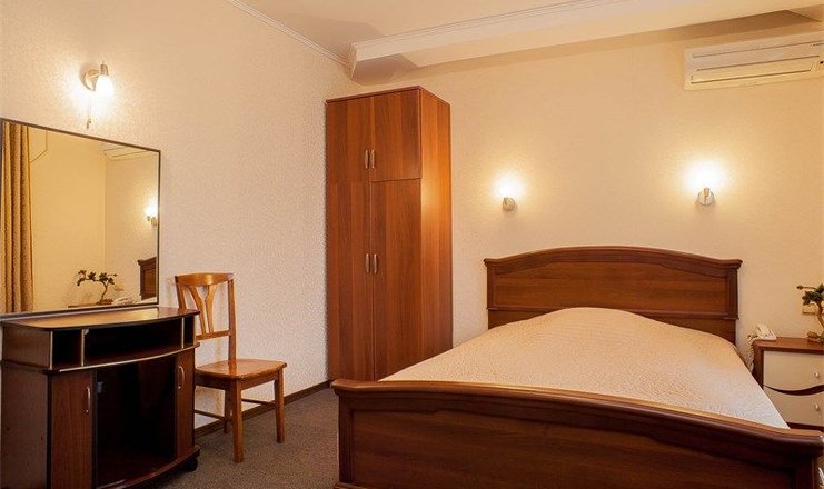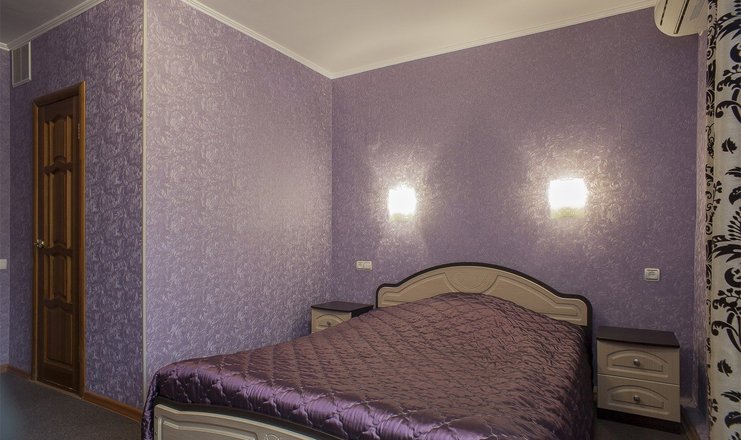В номере: кровать двуспальная, прикроватные тумбочки, стол, стул, шкаф, кондиционер, набор посуды, телевизор, телефон, холодильник