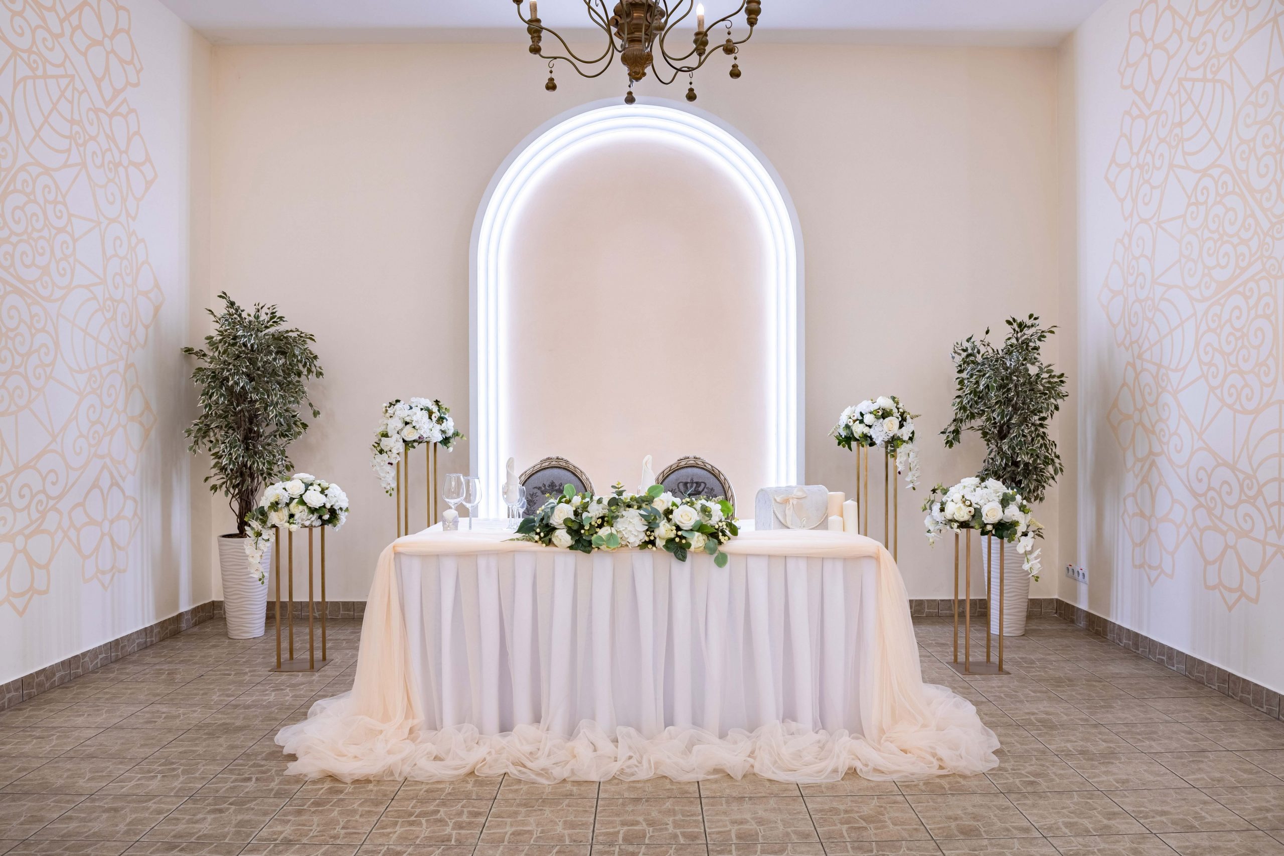 Для свадебных церемоний имеется закрытый летний дворик. В центре банкетного зала — широкий удобный танцпол. В стоимость услуг включено профессиональное звуковое и световое оборудование.