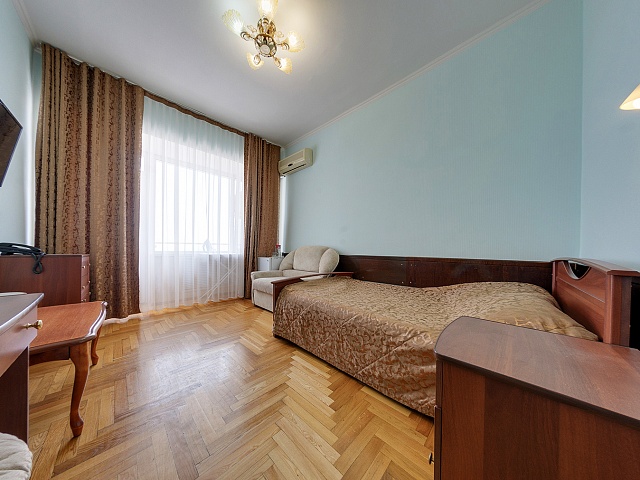 В номере: кровать полутороспальная, комплект - кресло (раскладное), пуфик, тумба прикроватная, журнальный столик, стол туалетный с зеркалом, встроенный шкаф, тумба TV, телевизор, холодильник, кондиционер, телефон