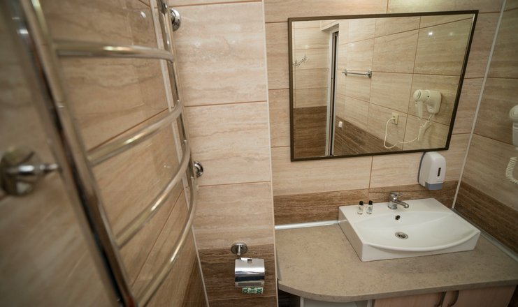 В номере: шкаф-купе, стол-тумба, 2 стула, кровать 1,20 м., ЖК телевизор, кондиционер, холодильник, зеркало, вешалка для верхней одежды.