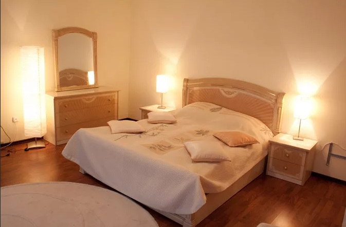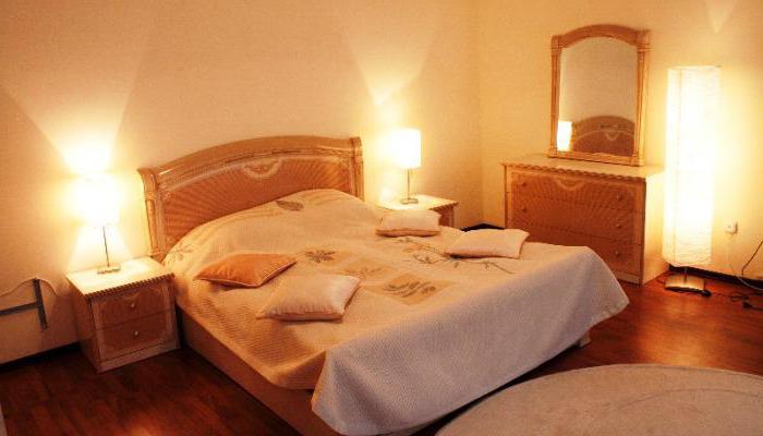 В номере: кровать двуспальная, прикроватные тумбочки, стол, стулья, шкаф, диван, телевизор, холодильник, чайный набор посуды