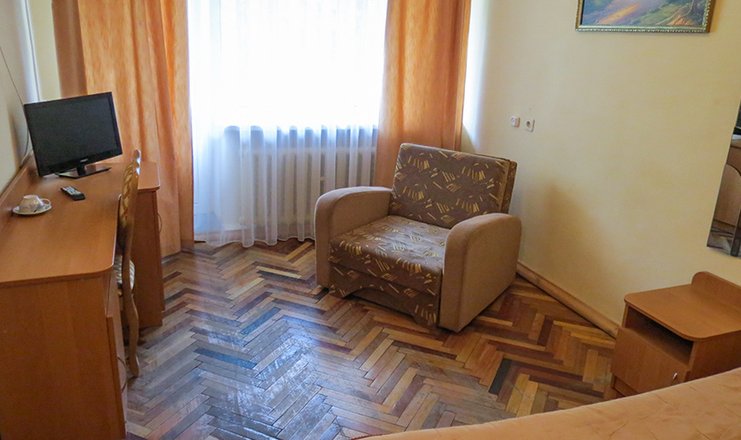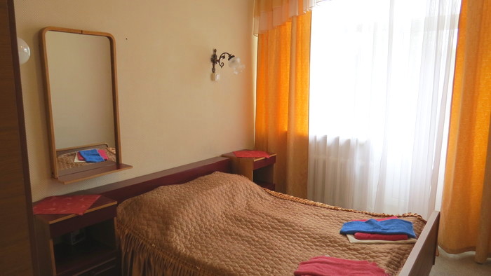 В номере: вешалка, зеркало, кровать односпальная, прикроватные тумбочки, стол, стул, шкаф, раскладушка на доп. место