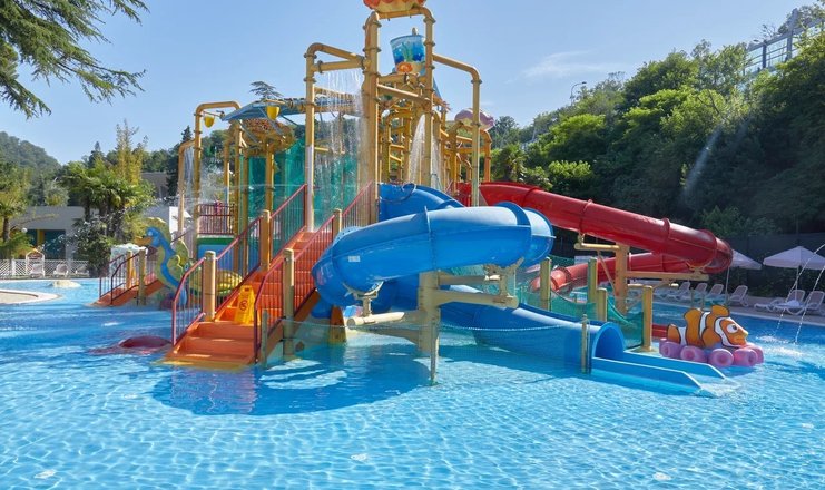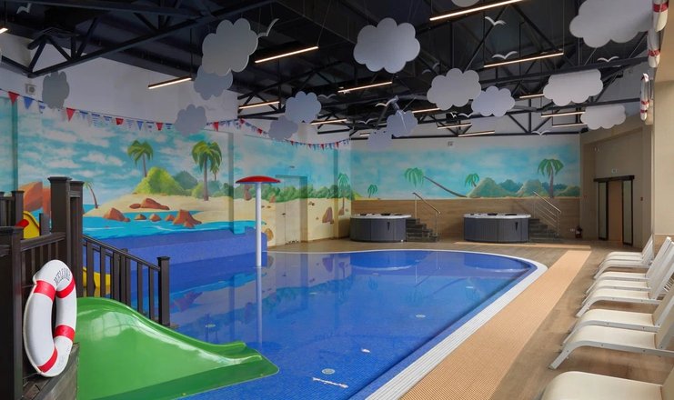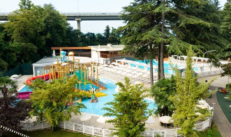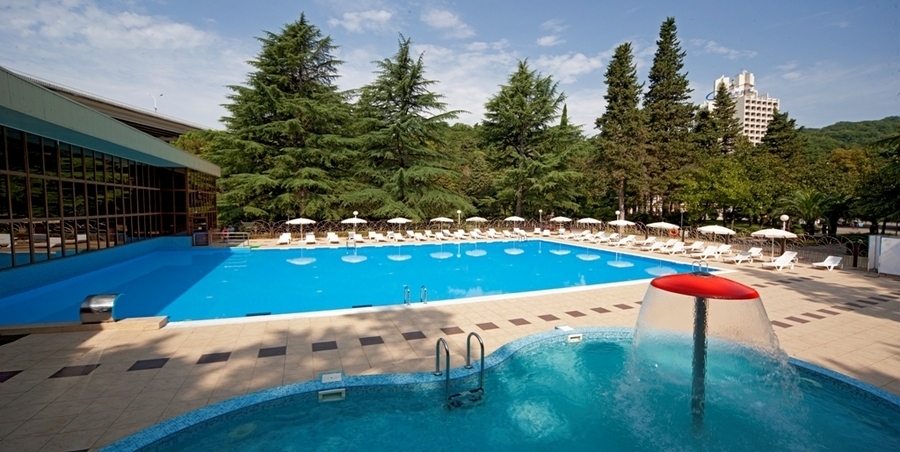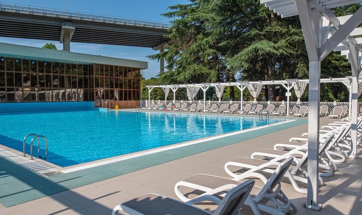 Открытый плавательный бассейн в сантории Спутник в Сочи, с подогреваемой водой +27 C (всесезонный), с каскадным водопадом, противотоками и гидромассажем, длина дорожки 25 м, глубина 1,8 м; «малая чаша» бассейна (работает в летний период).