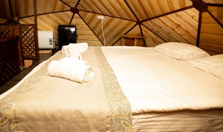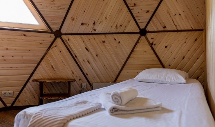 В шале: диван раскладной, кровати односпальные: 2 шт., кровать двуспальная, мягкий уголок: в гостиной, стол, стулья, шкаф, кондиционер, мини-холодильник, набор посуды, телевизор, чайный набор посуды, электрочайник
