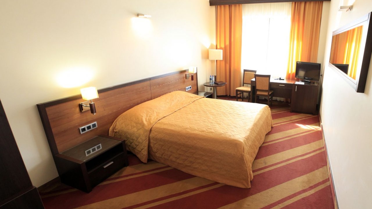 В номере: двуспальная кровать размера 1,8 м на 2 м, тумбочка,стул и письменный стол, настольная лампа, шкаф, ЖК телевизор, телефон, мини-бар, электрический чайник, набор посуды, сейф, бесплатный wi-fi, кондиционер