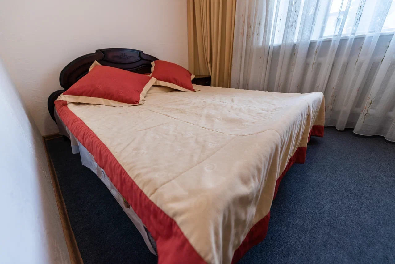 Оснащение номера: кровать двуспальная, прикроватная тумбочка, стол, стул, шкаф, телевизор, холодильник, чайный набор посуды, электрочайник