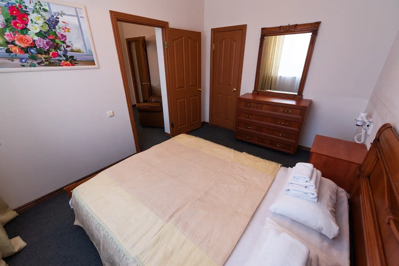 Оснащение номера: кровать двуспальная, прикроватная тумбочка, стол, стулья, шкаф, комод, диван, журнальный стол, телевизор, холодильник, чайный набор посуды, электрочайник